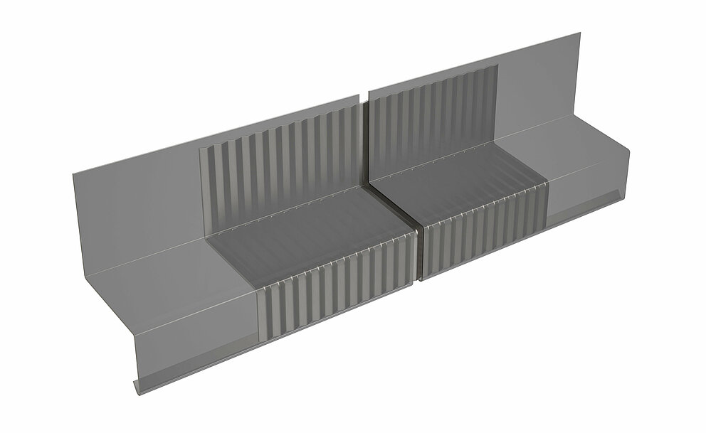Once the rail and bracket system has been completed, start with installation of abutment trim, base profile, perforated flashing and drip edge. The rain guard joint is overlapped and glued down. The (concealed) underlying rain guard is then cut into so that the overlying rain guard can be installed.