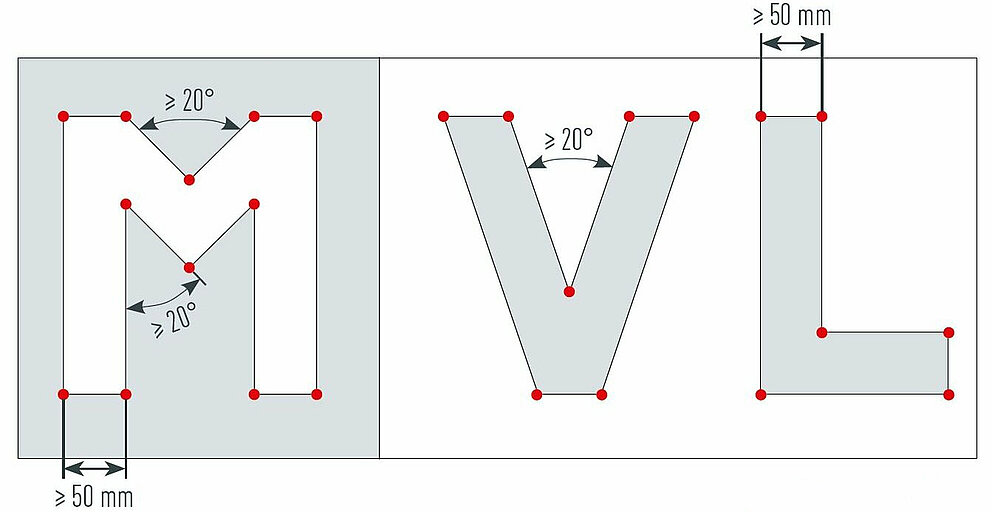 Observe the minimum dimensions and angles that are technically possible as far as the material is concerned. Acute angles can be produced from an angular opening of 20°. If the angular opening is less than 20°, the tip of the angle must be finalised using a bar of at least 25 mm.