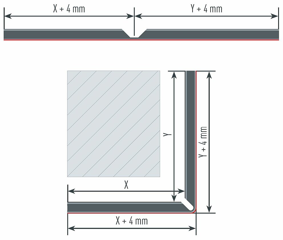Make sure that, after folding, the composite panel always springs back slightly. In practice, this means that the bend must be folded a little more than desired so that the perfect dimensional accuracy is achieved after the panel springs back. The smallest possible side length of a termination is 20 mm.