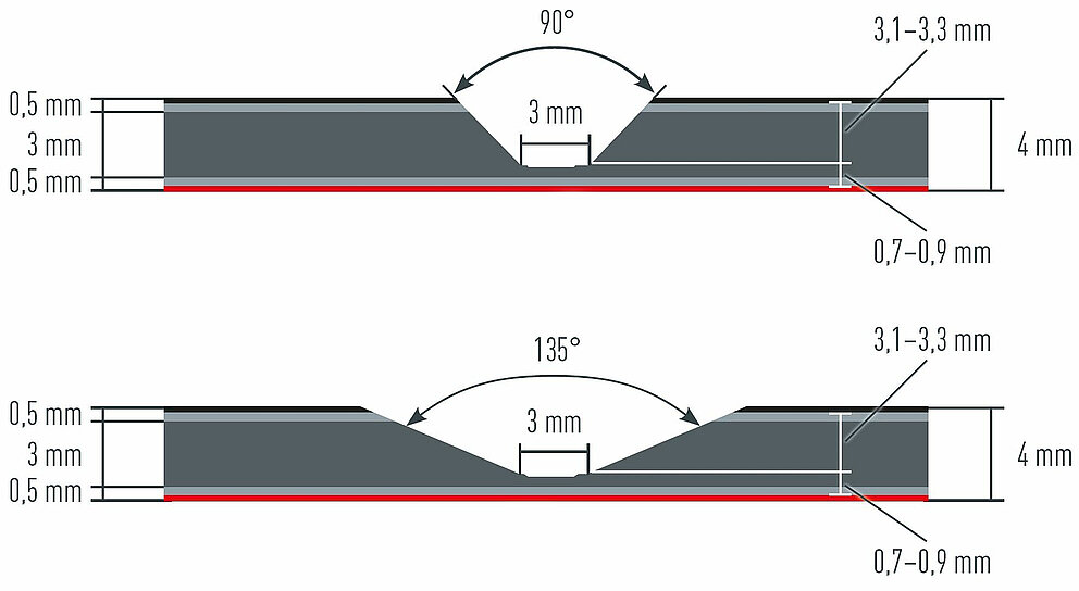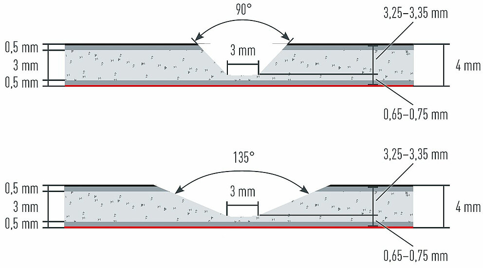 The V-groove required to make folds, whether for internal or external corners, should always be cut on the back of the panel. Correct V-groove cutting must be carried out in such a way that, on the one hand, 0.5 mm of the top layer (coated visible side) and, on the other hand, a further 0.2 to 0.4 mm (FR core) or a further 0.15 to 0.25 mm (A2 core) remain.