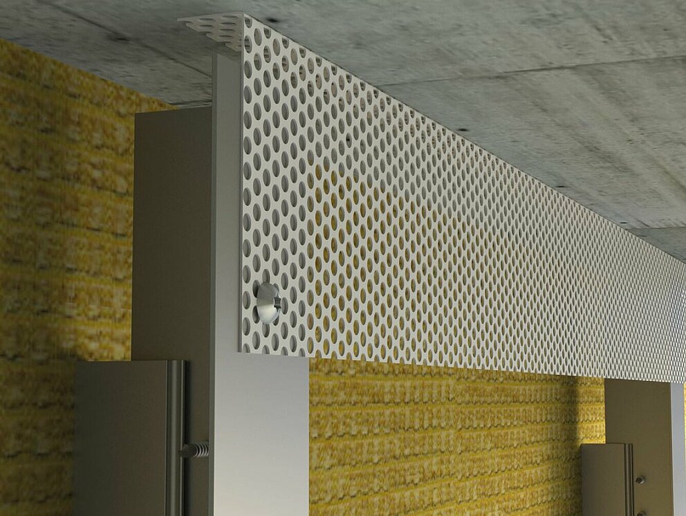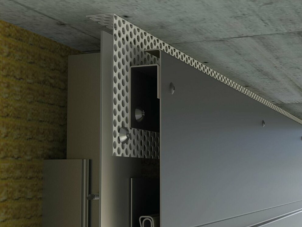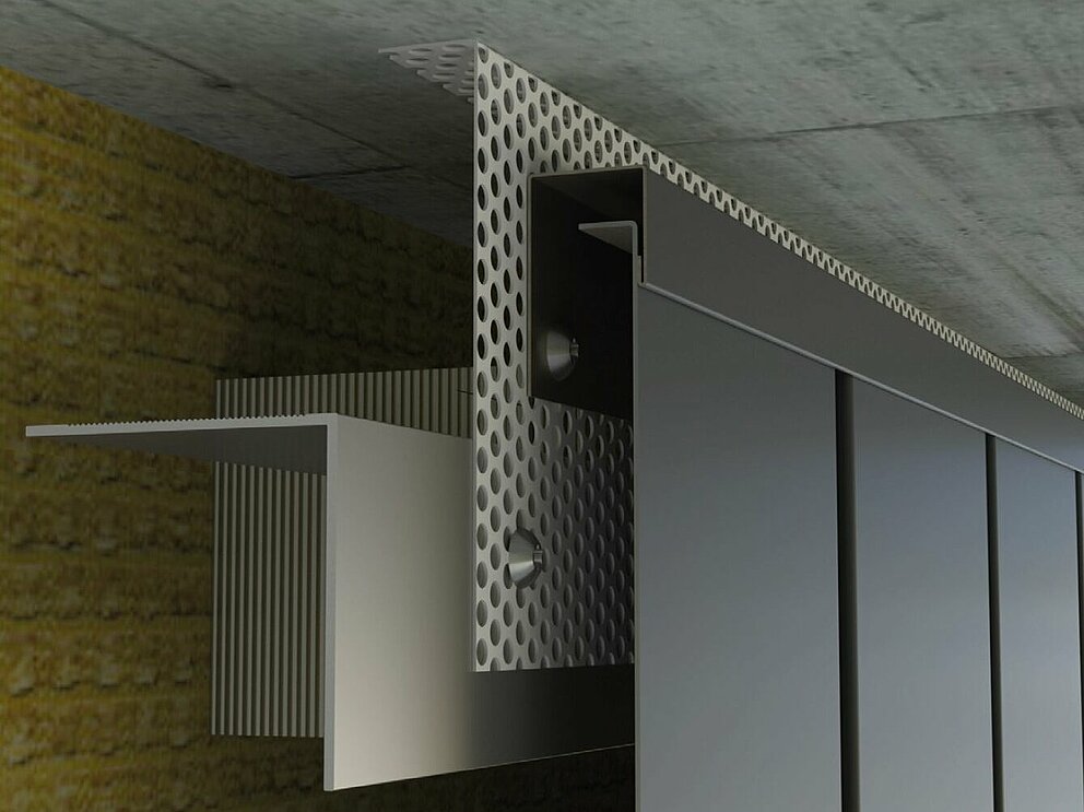 For a neat detail of the horizontal siding façade, it is necessary to trim the last siding vertically to make it suit the required dimensions. In order to install the siding, siding.X or perforated siding without a fixing strip, an additional flashing strip is required. First mount the flashing strip to the substructure and then fasten the shortened siding to the flashing strip using PREFA patent rivets.