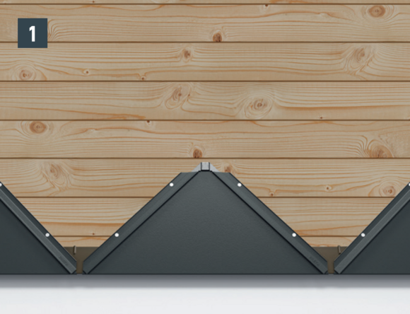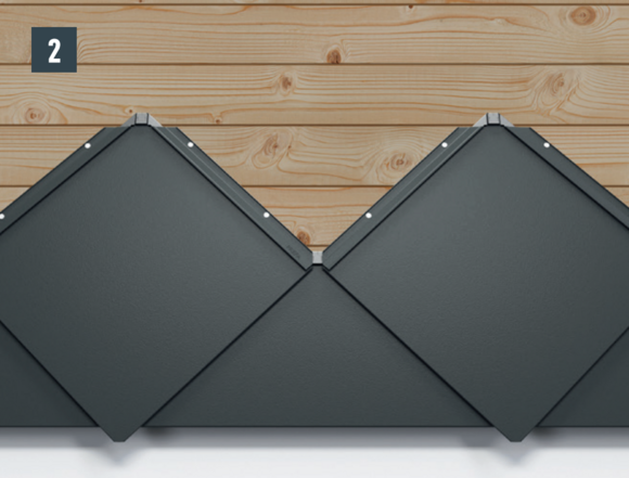 Each 44 × 44 rhomboid façade tile is fastened directly through the pre-punched fastening hole with four supplied ring nails 2.8/25.
