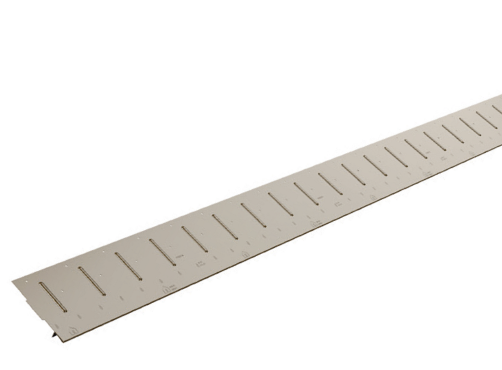 Once the details for the base area of the rainscreen (perforated metal plate and cover flashing) have been mounted, installation can begin using the starter strip. The starter strip is always the start of the construction of a façade with PREFA small-format products. The precise installation of the starter strip is important, as this significantly shapes the appearance of your façade.