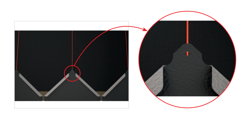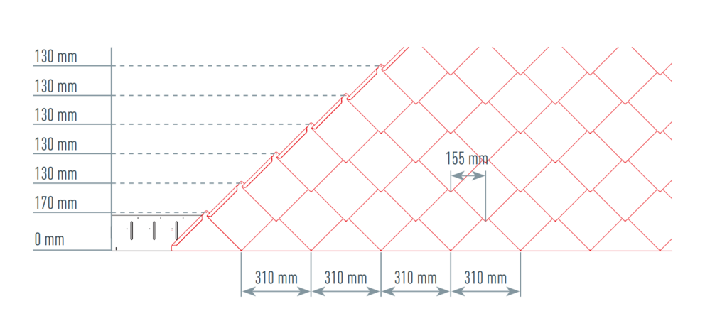 To help with the installation of the PREFA rhomboid façade tiles 20 × 20, it is advisable to create a grid of vertical lines at a distance of 310 mm (the markings on the starter strip can be used as a guide). In order to keep the dimension exact in each row, half of the layout dimension can also be marked and checked at regular intervals if necessary. Align the starting plates with the notches (on the top edge of the starting plates) on the vertical chalked lines (Figure 30). The markings on the starter strip are not decisive for the 20 x 20 rhomboid façade tile. It should be noted that the area for the lateral upstand (e.g. abutment detail or building corners) is not in the centre of the 20 x 20 rhomboid façade tiles (observe symmetry of façade surface).