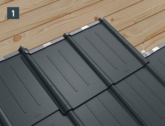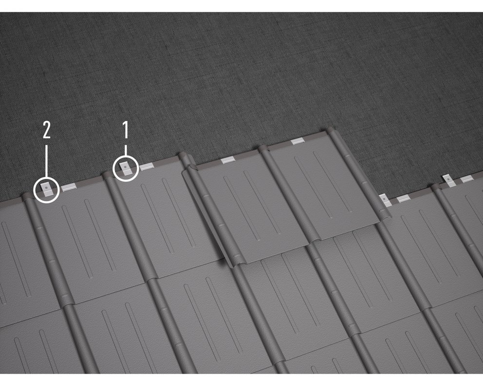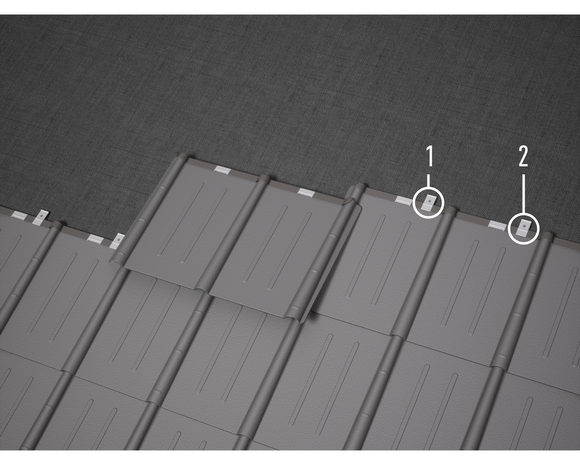 The roof tiles make laying in both directions possible. Roof tiles are always bonded, i.e. covered with offset joints. Half panels and frog mouth hatches can also be covered end to end (Image 1).