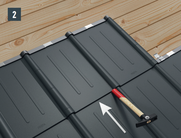 Press the panel into the hook fold. Strike the bottom edge of the panel lightly with the handle of the hammer (Image 2).