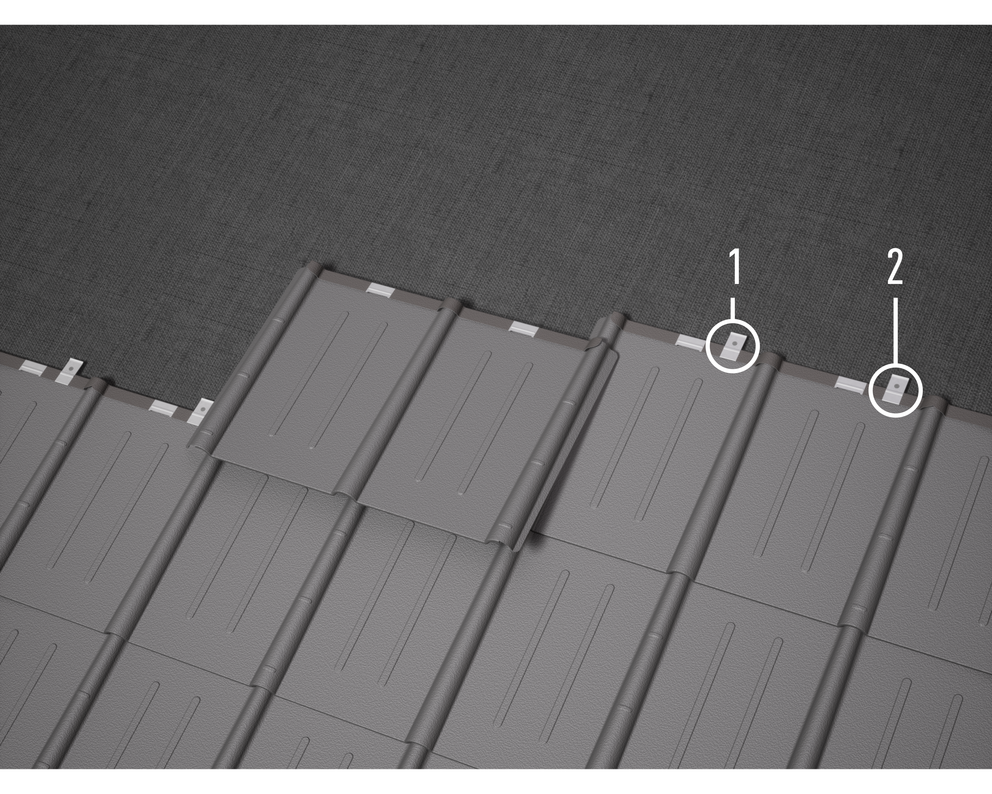 The clips must be set approx. 3 cm next to the panel groove. In areas particularly prone to storms, a wind load calculation is required and fastenings must be increased or decreased according to the calculation or screwed fastenings used instead of nailed ones. If the fastenings with an increased number of clips are not sufficient according to the calculation, an additional fastening can be attached to the side of the shaft outlet (underlying shaft) with 2 pcs. of SPAX screws per panel.