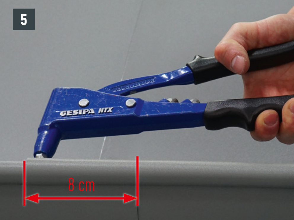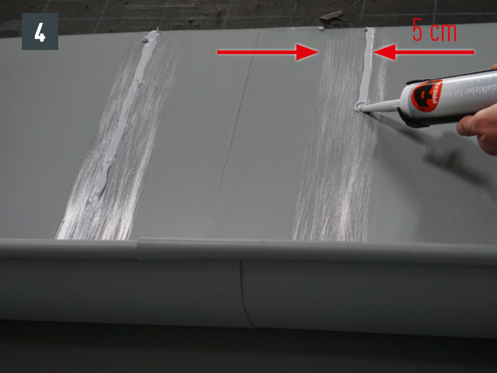 On-roof gutter joints can also executed with 20 pcs. of 4 x 9.5 mm PREFA rivets in a cross stitch version and sealed with PREFA silicone.