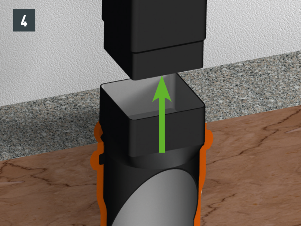 • Insert the square downpipe socket all the way down into the sewer pipe and mount square downpipe. Then push the square downpipe socket upwards and fix it to the PREFA square downpipe (Fig. 4).