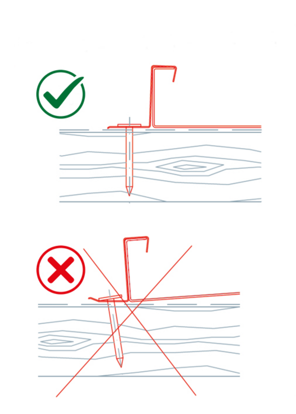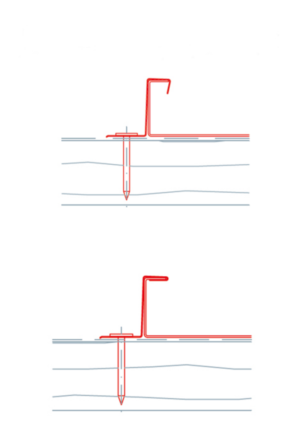 When fastening the PREFA stainless fixed clips, sliding clips and long sliding clips, ensure that the grooved nails are sufficiently countersunk and do not protrude above the height of the corrugation groove in order to avoid pressure and chafing marks on the installed roof covering. PREFA stainless steel fixed clips must be installed with 2 stainless steel grooved nails. PREFA stainless steel sliding/long sliding clips must be installed with 3 stainless steel grooved nails.