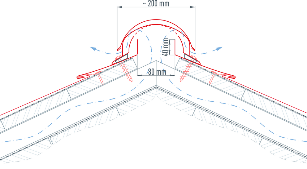 The original PREFA ridge vent has an apron on both sides. Nevertheless, raise the roof covering 40 mm to achieve a rainproof connection.