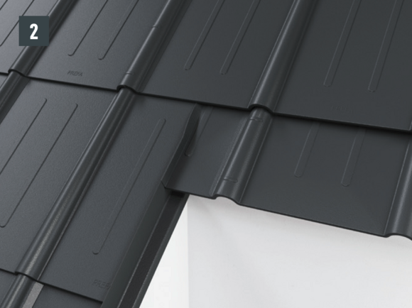 A simple ridge cap can be used if the distance between the PREFA roof covering and the ridge point is less than 150 mm, and no ventilation is required.