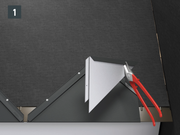 With each lateral upstand of the rhomboid roof tile 29 × 29 (verge flashing and edging), the folds running diagonally downwards are to be cut out and bent up on the underside.