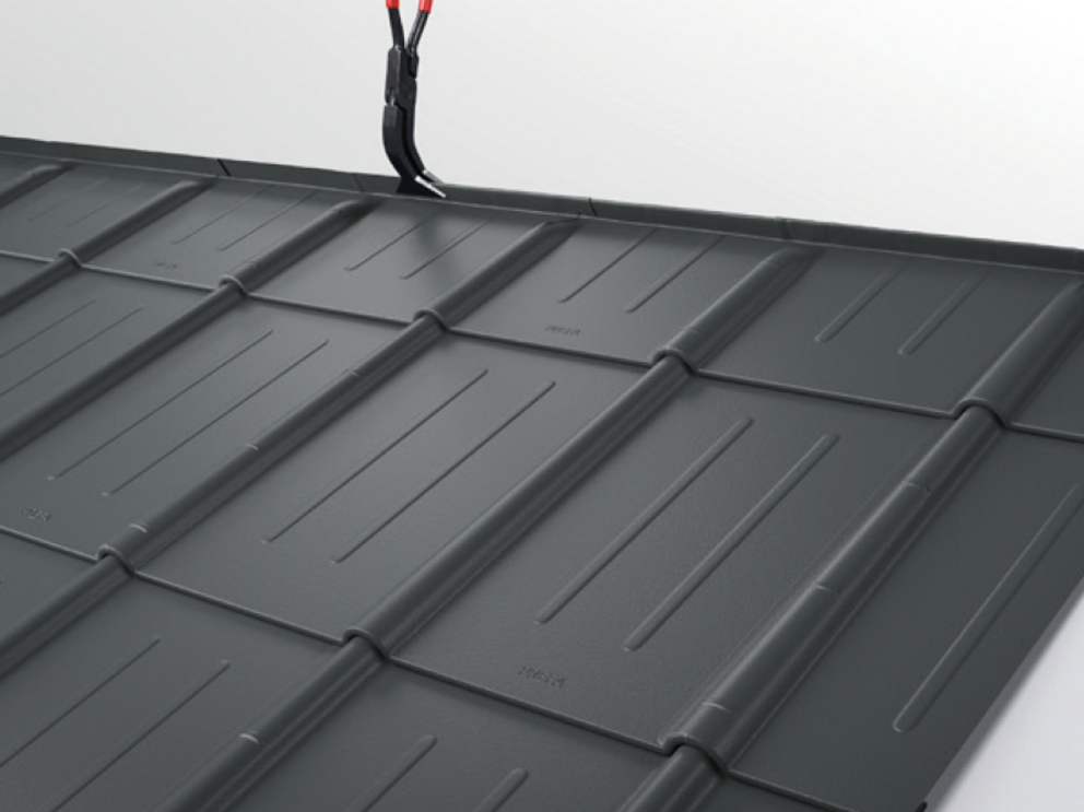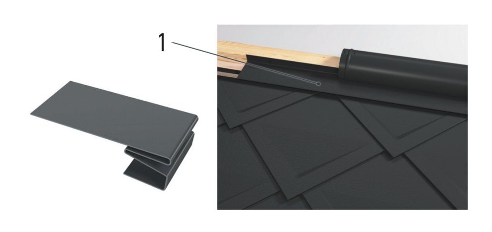 If a continuous apron flashing is fitted for rhomboid roof tiles 29 × 29 or 44 × 44, then end plates are to be used for the rhomboid roof tiles 29 × 29 or 44 × 44. These enable a horizontal flat lock welt.