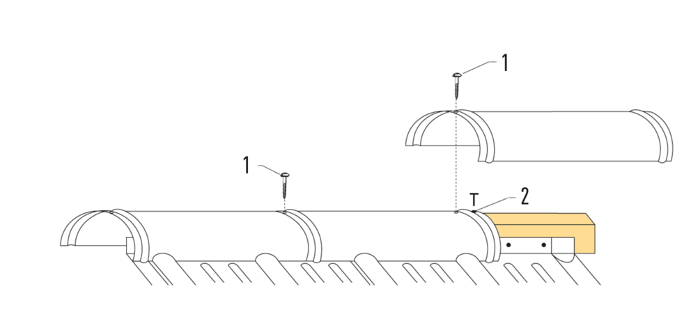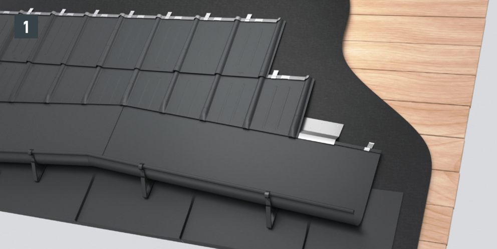 The supplied cover flashings (1) must be fitted between the end plates for rhomboid roof tile 29 × 29.