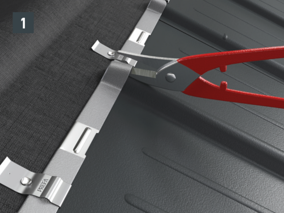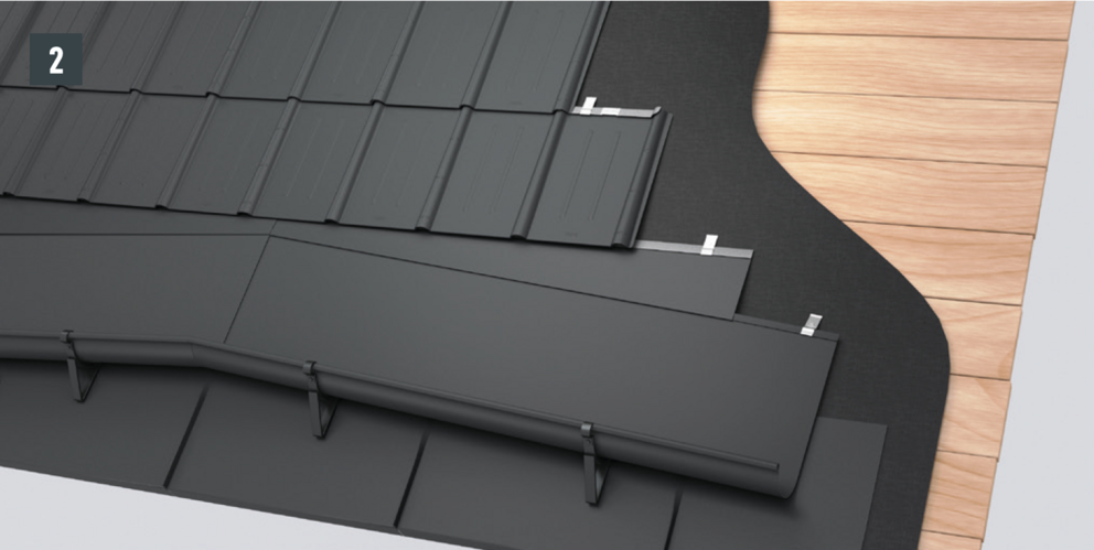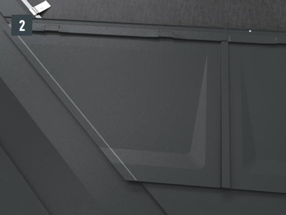 Notch the upper patent fold in the area of the raised edge so that a hook fold remains (Fig. 1 and 2), and bend the R.16 roof tile or the FX.12 roof panel upwards 30 mm at a right angle to the roof surface.
