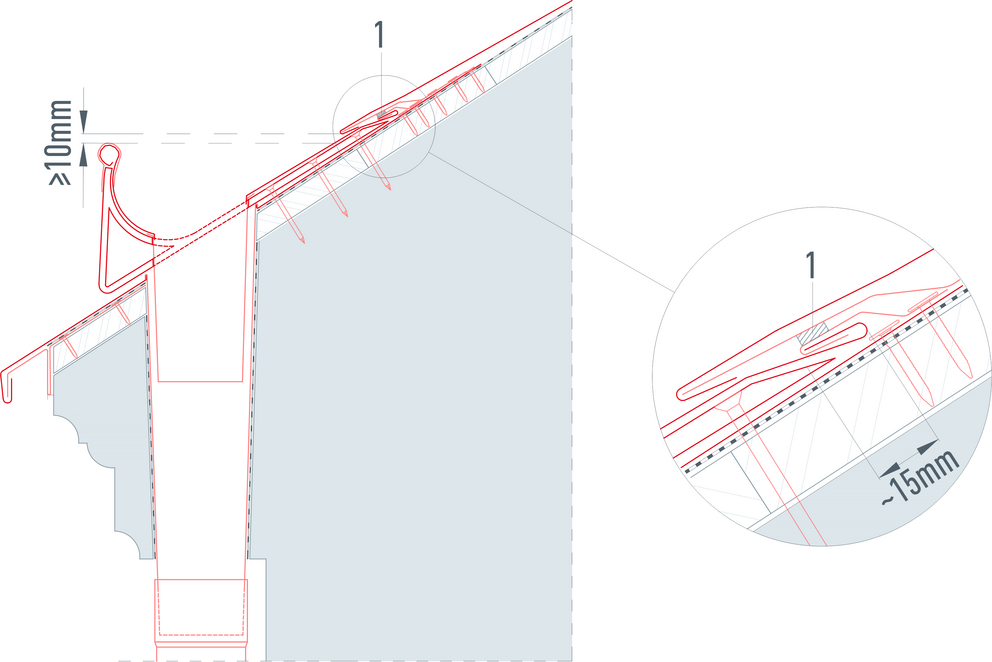 The eaves overhang of the starter strip should be in the rear third of the gutter width and may not exceed 80 mm.