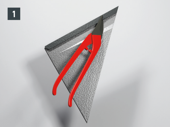 With each lateral upstand of the rhomboid roof tile 44 × 44 (verge flashing and edging), the folds running diagonally downwards are to be cut out and bent up on the underside.