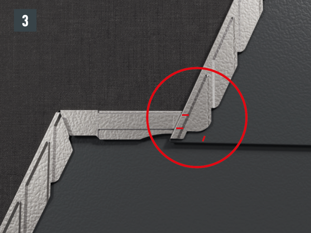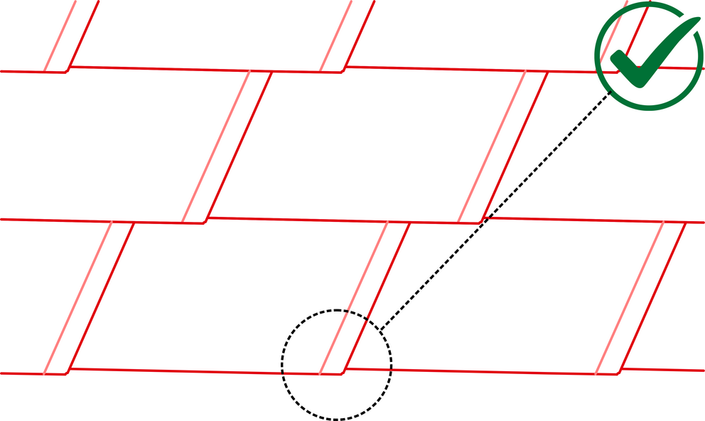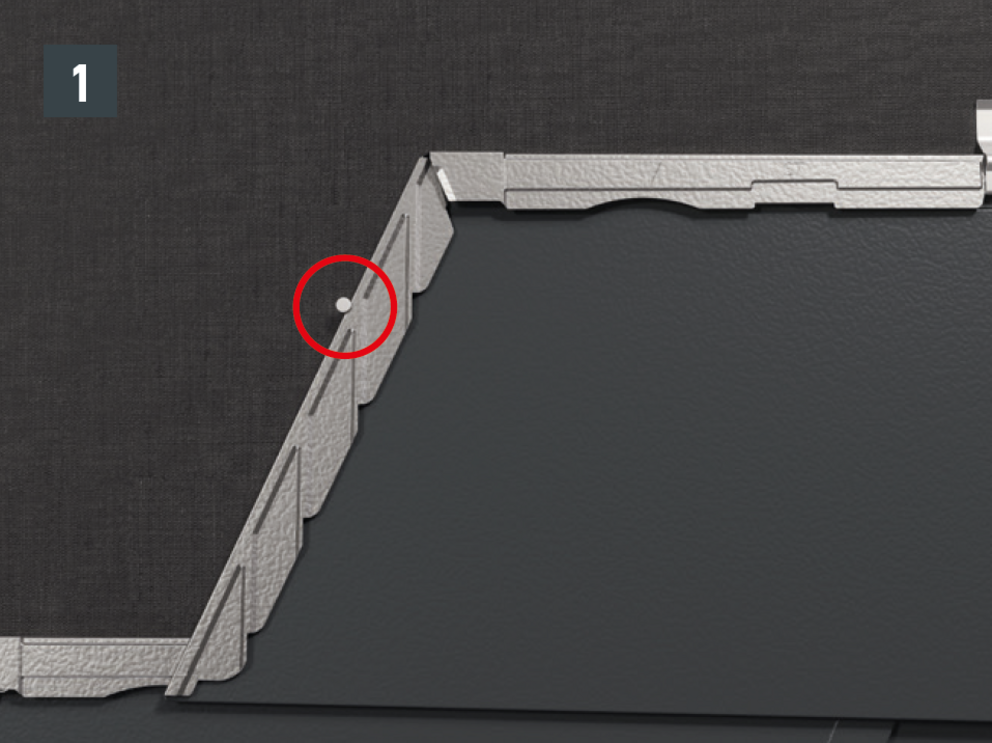 Due to the shape of the DS.19 shingle, there is a lowering at the heel of the DS. 19 shingle. Keep to this lowering when laying the first DS.19 shingle in each row by not pushing the first DS.19 shingel all the way to the top in the starter strip or fold. Leave the heel of the first DS.19 shingle until the upper shingle fold runs straight through over the entire length.