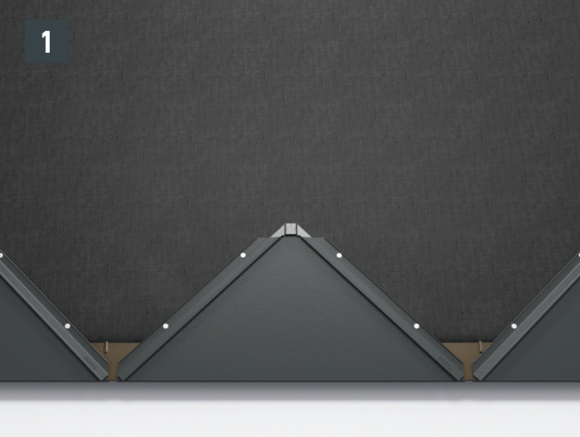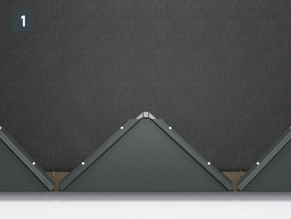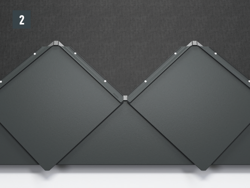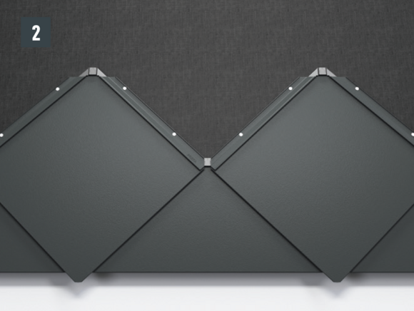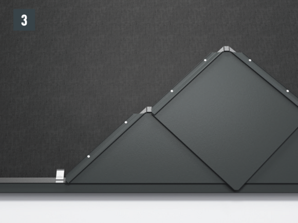 • Push rhomboid roof tiles 44 × 44 into the folds, align to the vertical lacing and fasten to the pre-punched holes with the supplied PREFA 2.8/25 grooved nails (standard fastening 4 pcs. per rhomboid roof tile 44 × 44) (Fig. 1, 2 and 3).