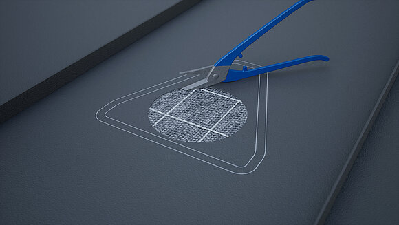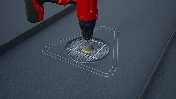 Position the solar roof conduit and mark the outline. Then mark the adhesive area (25 mm) and the cut-out of the pipe collar. Cut out and flare the circular area.