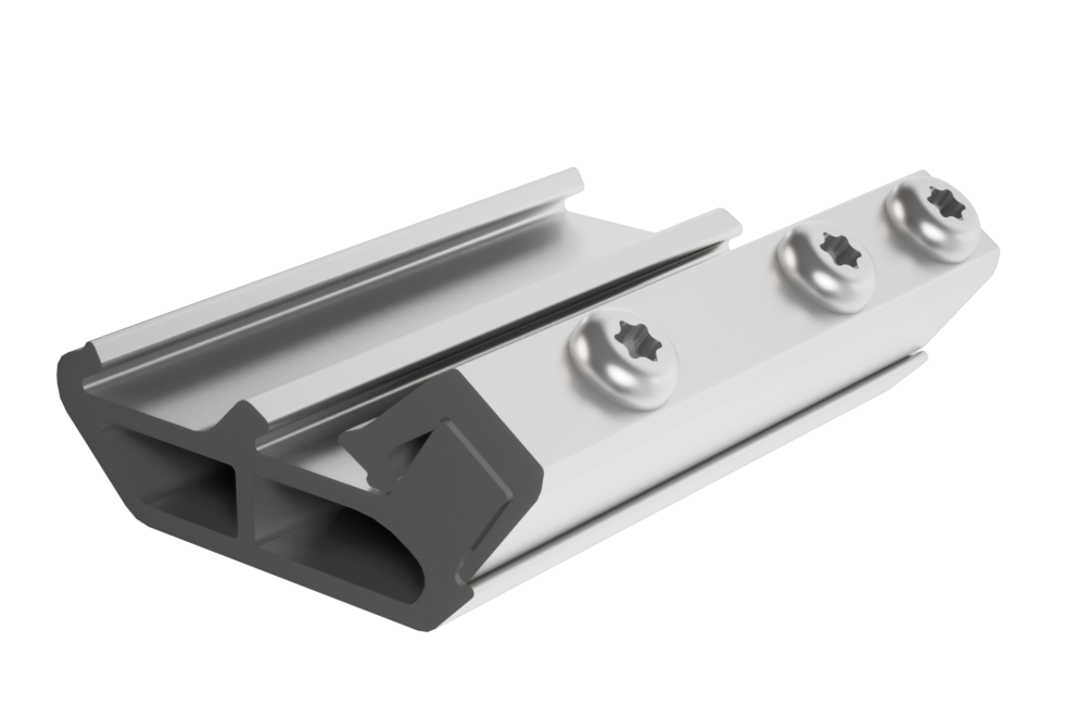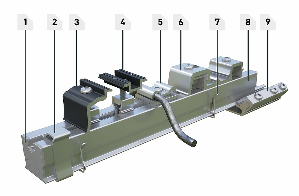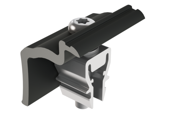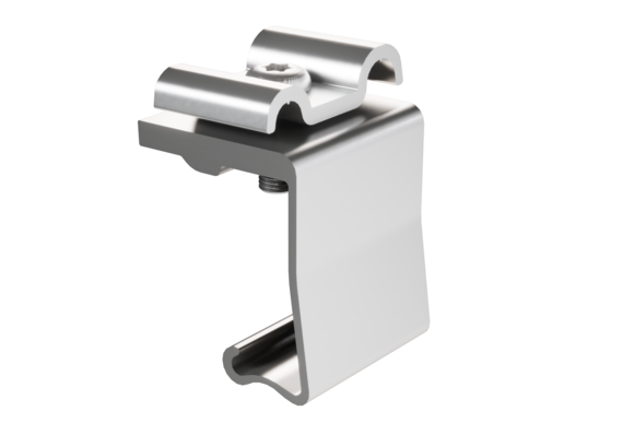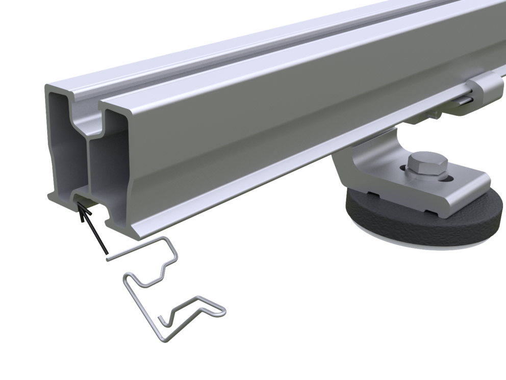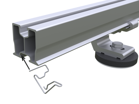 To prevent photovoltaic modules from falling, solar panel fall protection devices are installed in the PREVARIO solar mounting system. Two solar panel fall protection devices per module are clamped onto the upper module rail in the lowest module row of a generator area. This ensures that if a panel falls, the upper edge of its frame remains attached to the protection device. A protection device which has been activated is only a short-term safety solution Affected modules should be reinstalled immediately.