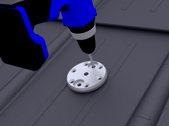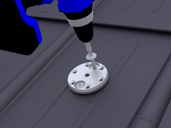 Attach each foot part to the rafter with six fixing screws ⌀ 6.0×40/24 mm until the surface seal is pressed onto the roof covering and sub-structure framework. When mounted correctly, the surface seal should bulge slightly outwards (Torx bit: T25).