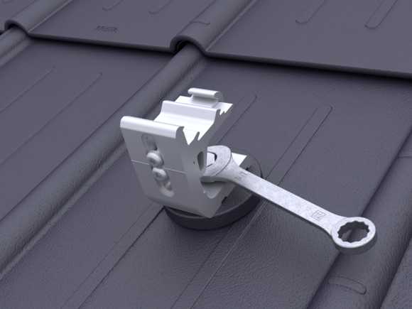 Attach the cover cap, place the base body onto the foot part, and then fasten with the hexagon head screw (open-end wrench: SW 18). The PREVARIO 3.S is suitable for mounting on PREFA small-format coverings.