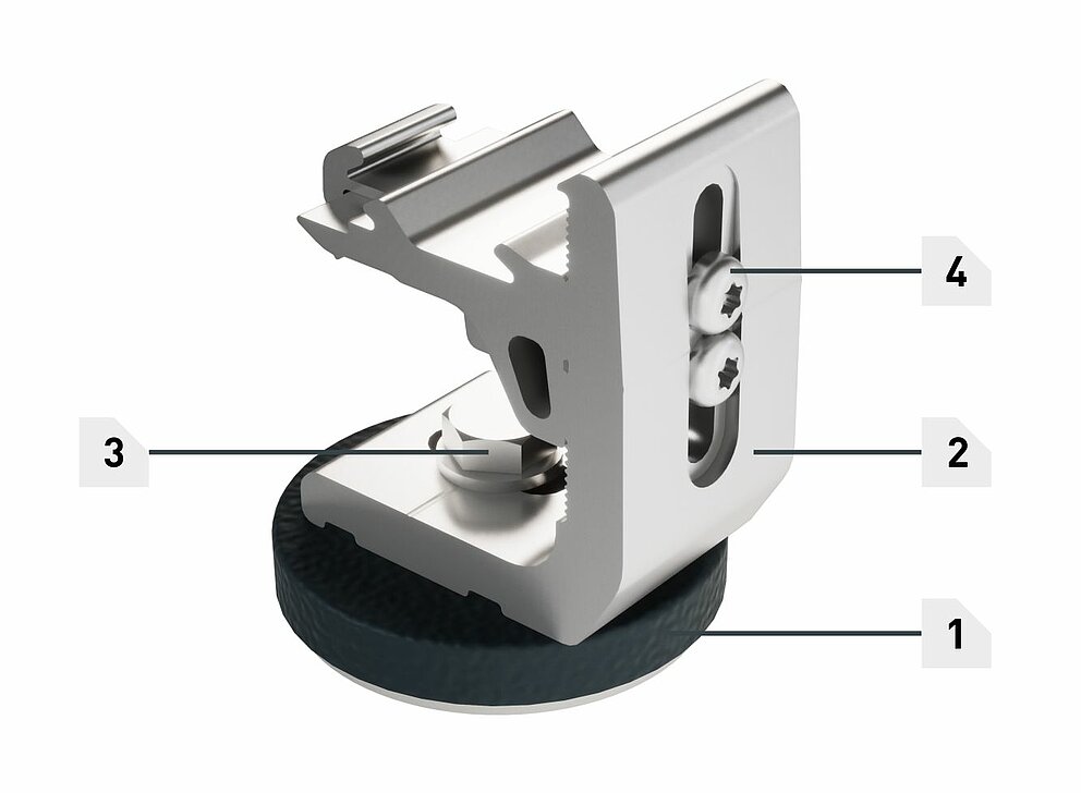 The mount should not be attached on a seam or crest of the PREFA roof covering. If the position of the rafter does not coincide with the installation area, a base plate must be used.