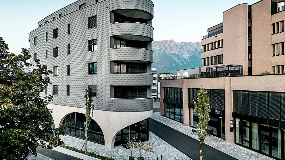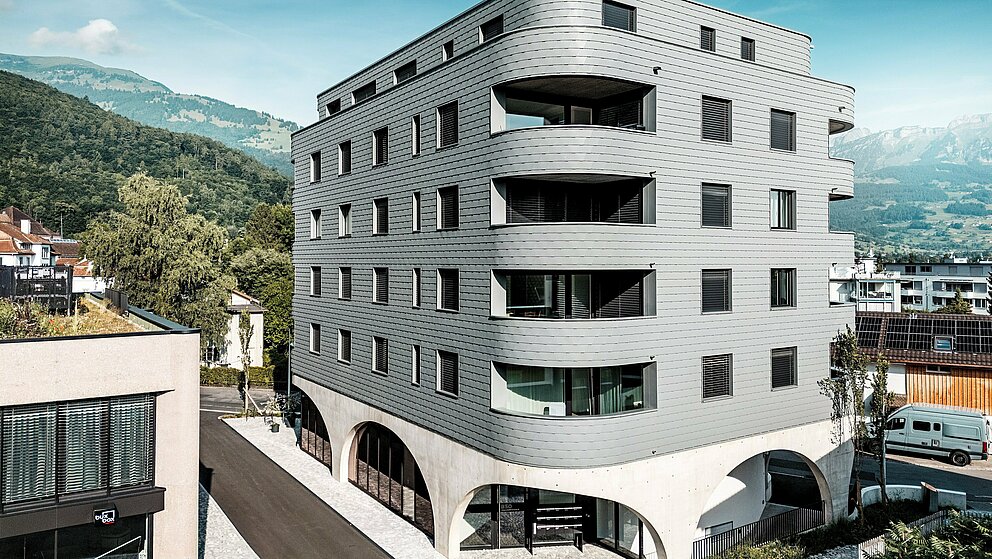 ‘Architecturally appealing, technically a major challenge,’ says Gabriel Landolt from Künzli Davos. The long-established Swiss company created the scale-like façade and has relied on the quality of PREFA for years: ‘On the one hand, the material is very light and at the same time weather-resistant. Visually, it is possible to create a homogeneous surface that is stylistically timeless and particularly durable. Like all PREFA products, the wall shingles used in Buchs are low-maintenance. And the aluminium can be sustainably recycled as a secondary raw material.’