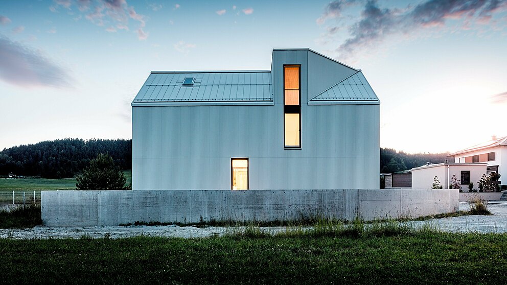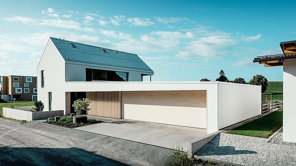 Das Bild zeigt das steile, markante Satteldach dieses Einfamilienhauses in Freistadt, das mit PREFALZ in der Farbe Reinweiß verkleidet ist. Die präzise gefaltete Fassade und das Dach sind nahtlos miteinander verbunden, was eine elegante, klare Linienführung erzeugt. Das verwendete PREFALZ für Dach und Fassade gewährleistet nicht nur eine ästhetische Beständigkeit, sondern auch eine hohe Witterungsbeständigkeit. Dadurch wird dem Gebäude langfristige Langlebigkeit und Pflegeleichtigkeit verliehen. Das Zusammenspiel von modernem Design und funktionalen Materialien schafft eine harmonische, zeitgemäße Architektur, die sowohl praktisch als auch optisch überzeugt. Besonders ins Auge fällt die Gaube mit dem schrägen Verlauf und dem über zwei Etagen ragenden Fenster.