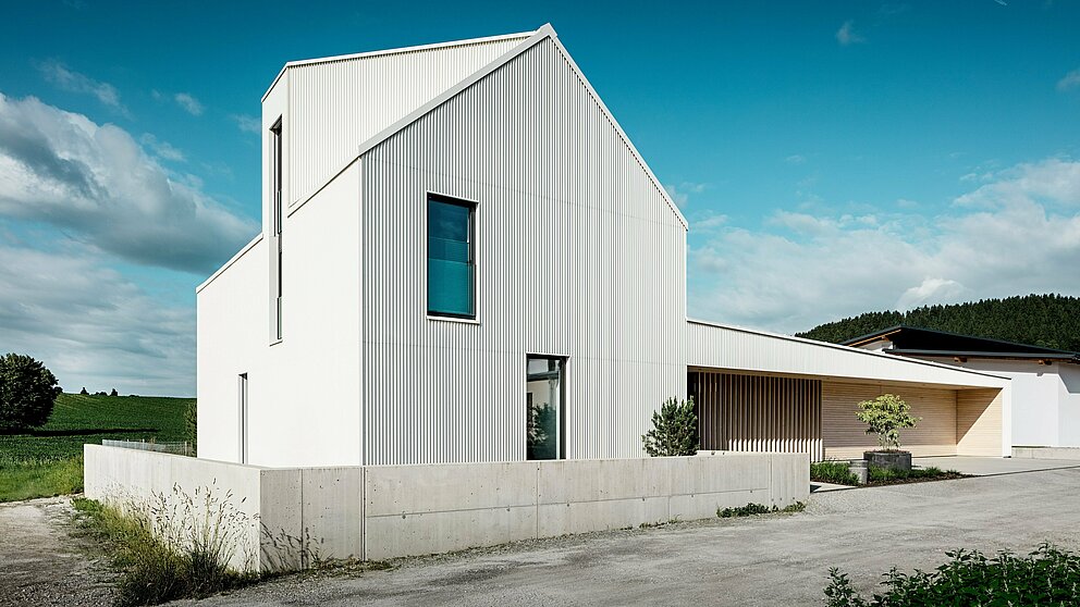Material: standing seam roof and façade PREFALZ, P.10 pure white