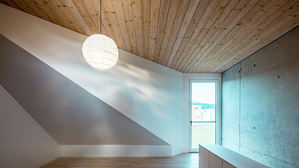 With its monolithic form and monochrome white façade, this striking corner building conveys purism in geometric perfection. Two structures – one with a flat roof, the other with a pitched roof – are joined together in an L-shape, creating a sheltered inner courtyard with a covered terrace. There are no classic roof overhangs, but instead accentuated edges on the gables, eaves and parapet. Internal rooms open up to the roof, allowing the view to wander into the distance through strategically placed windows. The large dormer window illuminates the depth of the rooms. Polished concrete floors, light silver fir wood surfaces and white glazes on wood lend the interior an elemental clarity and create a haven of tranquillity.